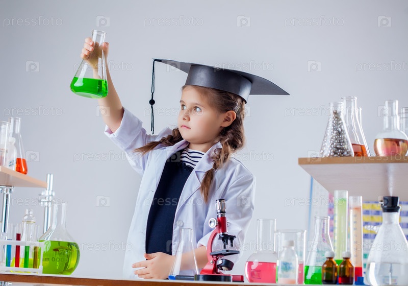Маленькая девочка проводит опыты в химической лаборатории
