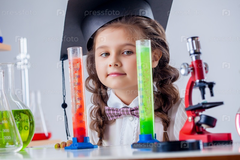 Девочка позирует с микроскопом в лаборатории