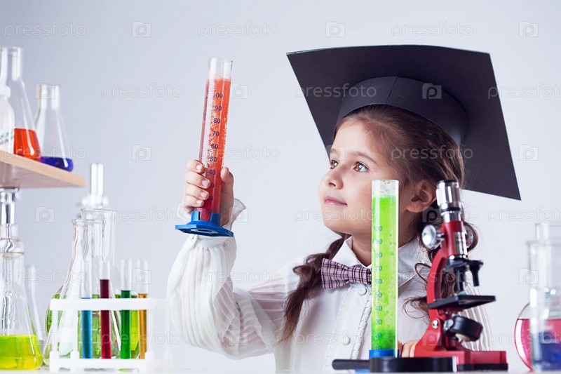 Маленькая девочка проводит опыты в химической лаборатории