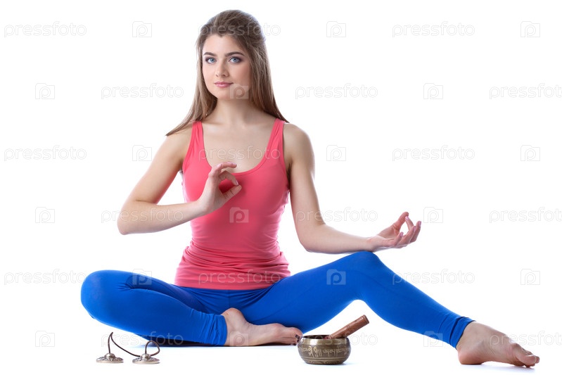 Медитирующая брюнетка, изолированная на белом фоне