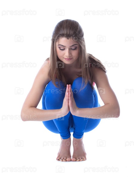 Медитирующая брюнетка, изолированная на белом фоне