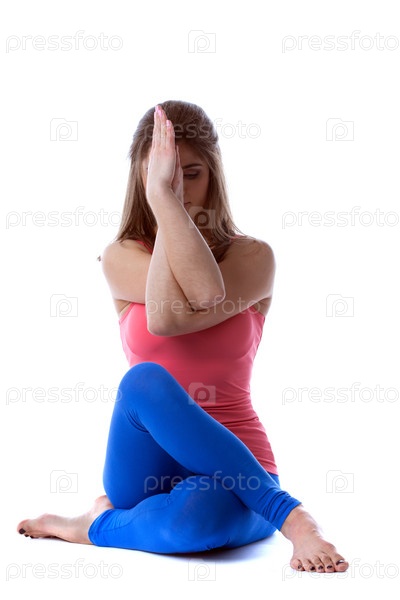 Медитирующая брюнетка, изолированная на белом фоне