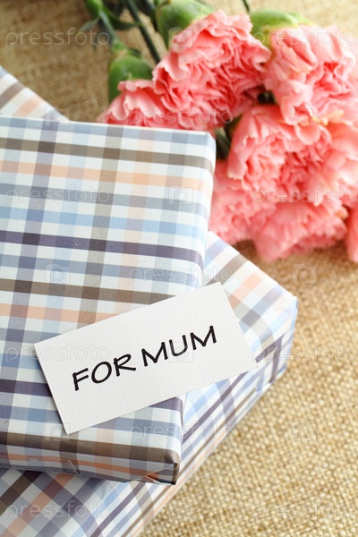 Подарок и розовые гвоздики на день матери