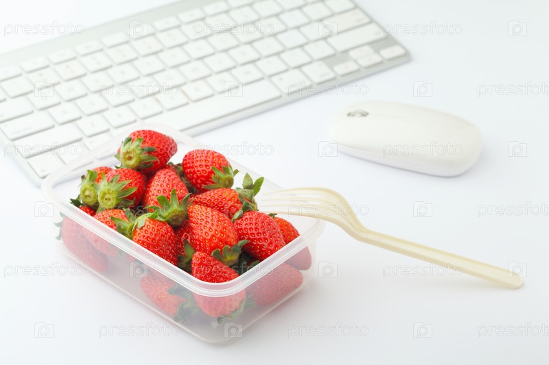 Коробка клубники на офисном столе