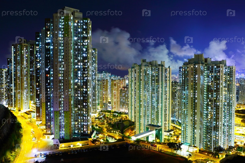 Освещенное жилое здание в Гонконге