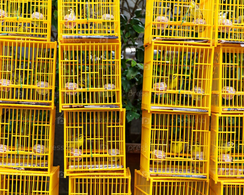 Птицы в клетках на рынке птиц в Гонконге