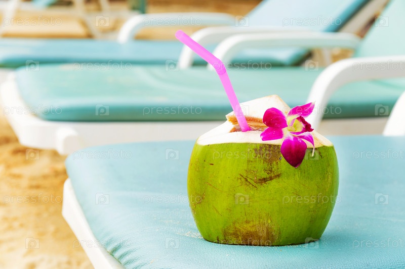 Кокос с соломинкой на пляжном шезлонге