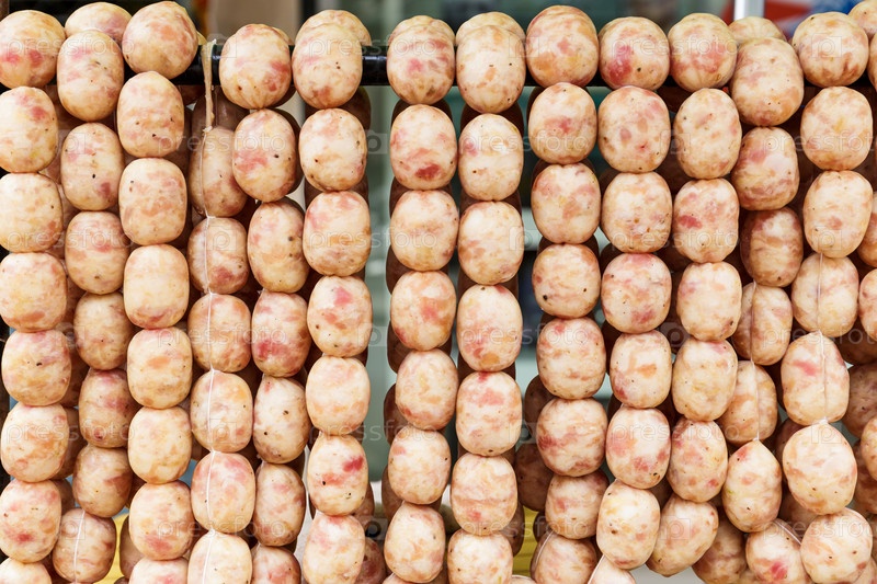 Свежая колбаса на уличном рынке в Таиланде