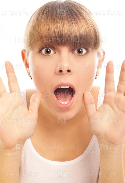 Молодая шокированная девушка на белом фоне