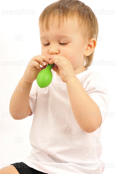 Маленький мальчик надувает воздушный шарик, изолированный на белом фоне
