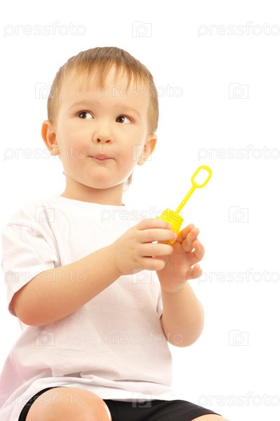 Маленький мальчик надувает мыльные пузыри