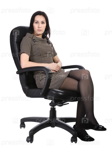 Молодая брюнетка сидит на офисном стуле