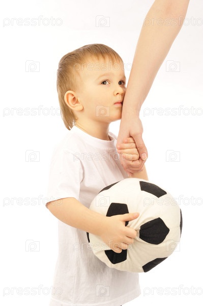 Маленький мальчик с футбольным мячом держит отца за руку