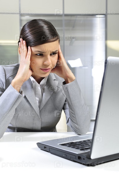 Молодая бизнес-леди решает проблему, сидя перед ноутбуком