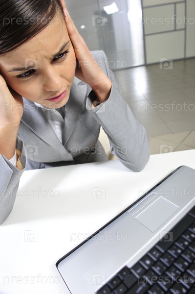 Молодая бизнес-леди в стрессовом состоянии перед ноутбуком