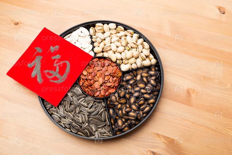 Ассорти из семечек и красный конверт с пожеланием благосостояния и удачи