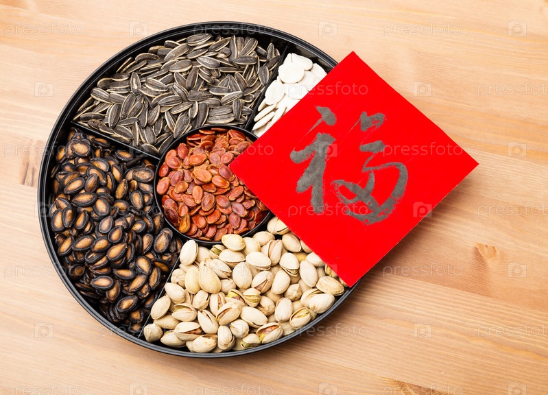 Ассорти из семечек и красный конверт с пожеланием благосостояния и удачи