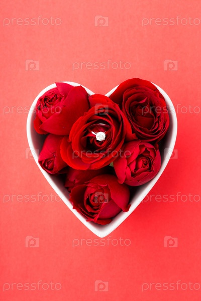 Розы и кольцо с бриллиантом в форме в виде сердца на красном фоне