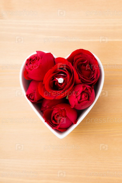 Роза и бриллиантовое кольцо в чашке в форме сердца