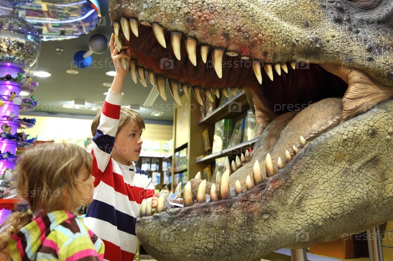 Мальчик и девочка смотрят на динозавра в музее