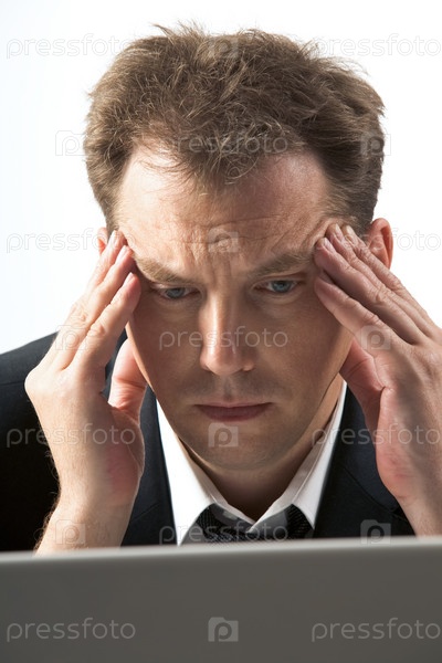 Фото разочарованного бизнесмена, касающегося его головы во время размышлений на работе