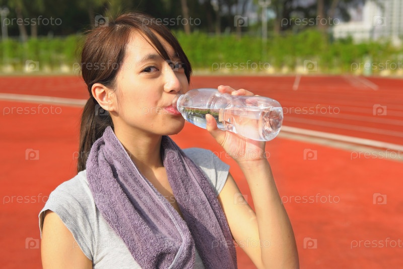 Молодая женщина пьет воду на тренировке на свежем воздухе