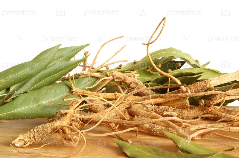 Кусок женьшеня или корней петрушки и свежих лавровых листьев на деревянном фоне