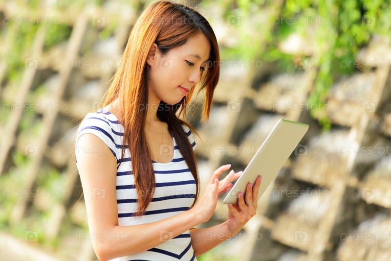 Молодая азиатская женщина с планшетным компьютером