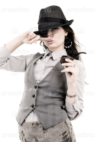 Молодая женщина с курительной трубкой на белом фоне
