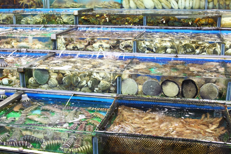 Морепродукты в аквариумах на рынке в Гонконге