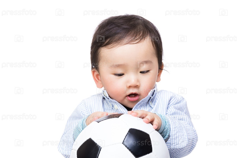 Азиатский мальчик смотрит на футбольный мяч