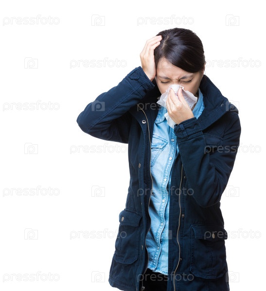 Женщина с головной болью чихает