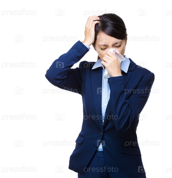 Азиатская деловая женщина чихает и держится за голову