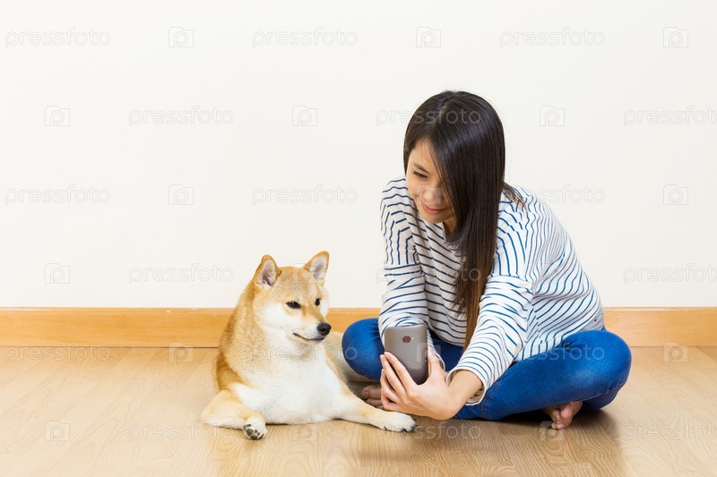 Азиатская женщина фотографирует себя и собаку
