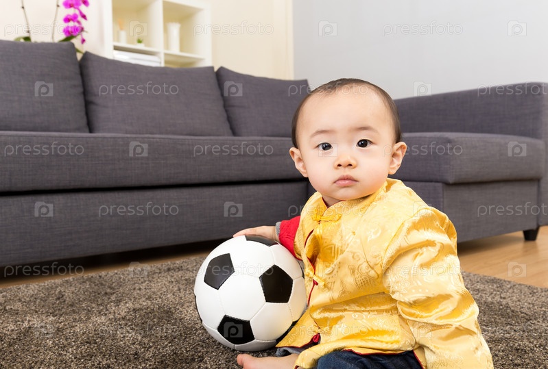 Азиатский ребенок с футбольным мячом дома