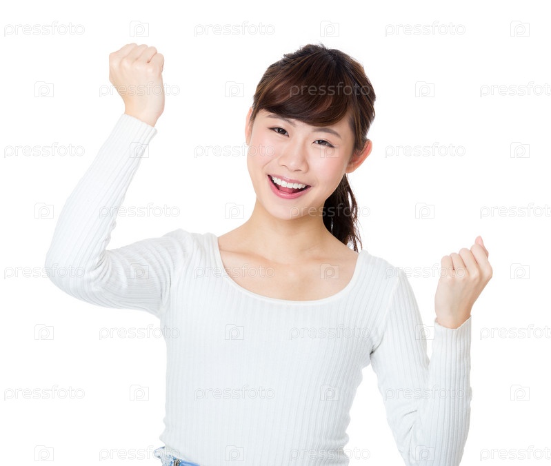 Веселая азиатская женщина с поднятыми вверх руками