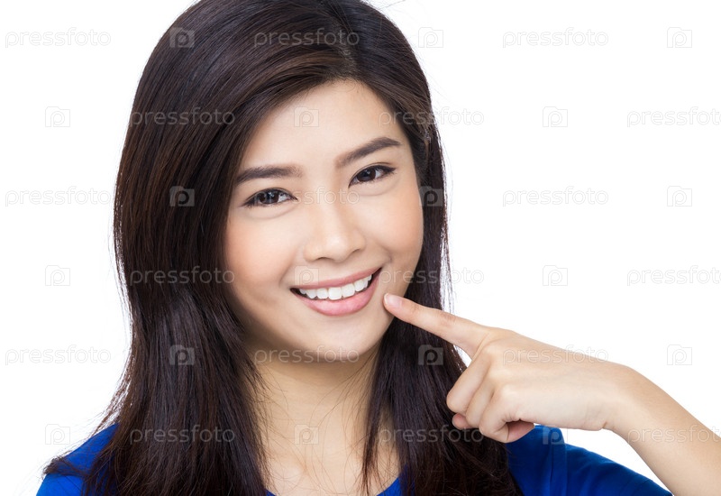 Азиатская женщина указывает пальцем на свой рот и зубы