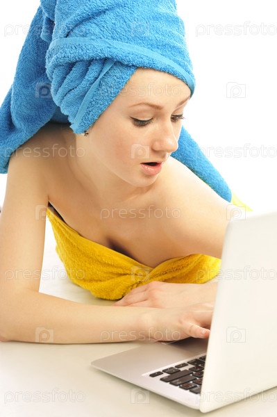 Девушка с ноутбуком на белом фоне