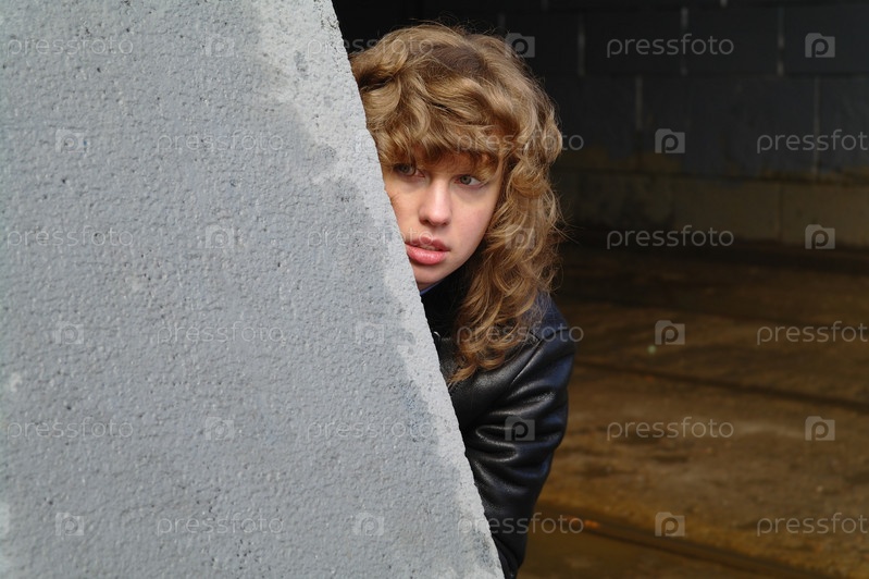 Красивая девушка осторожно выглядывает из-за угла бетонной стены