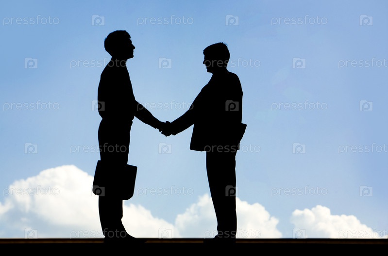 Изображение силуэта деловых партнеров, рукопожатые на фоне неба