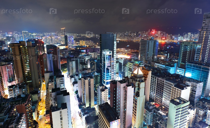 Переполненный зданиями Гонконг ночью