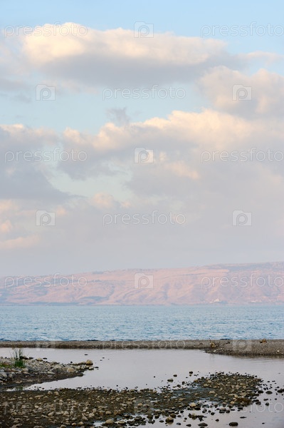 Галилейское море рано утром, рябь на воде и облака в небе