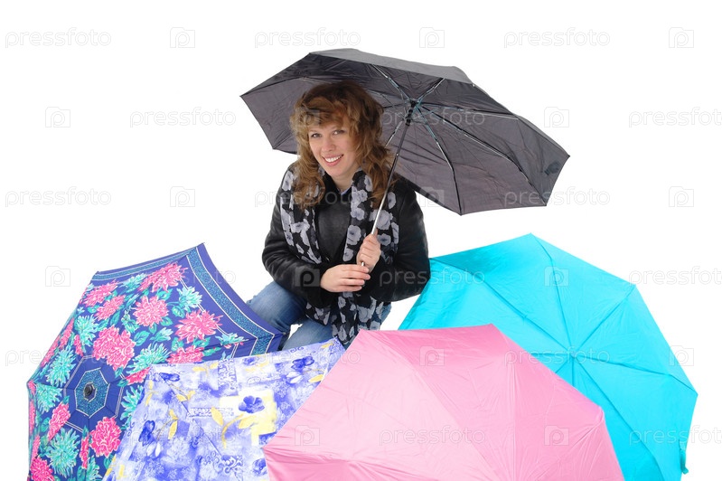 Красивая девушка держит разноцветные зонты на белом фоне