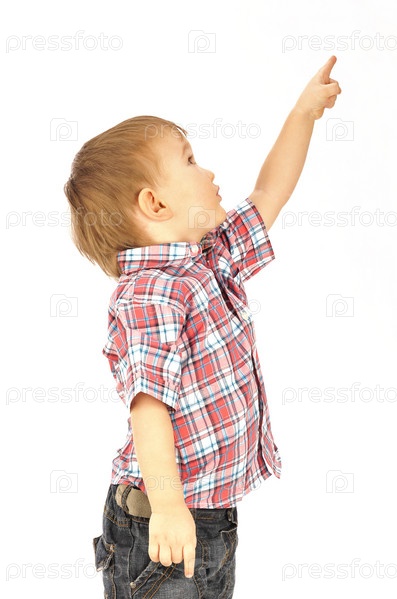 Портрет мальчика в рубашке и джинсах на белом фоне