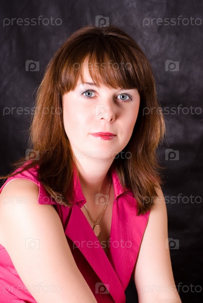 Портрет красивой девушки с коричневыми волосами и седыми глазами на темном фоне