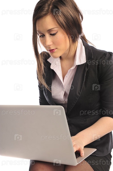 Красивая девушка работает с ноутбуком на белом фоне