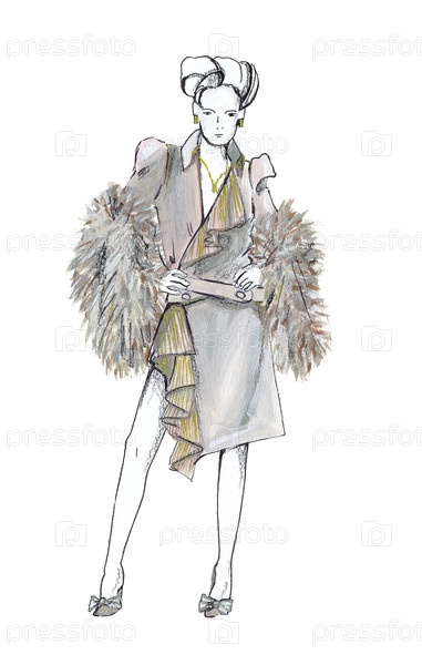 Женщина, одетая в осеннее пальто. Гуашь и тушь