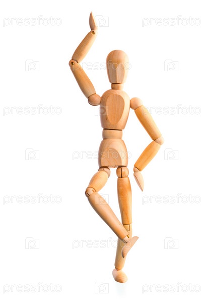 Деревянный манекен стоит на одной ноге