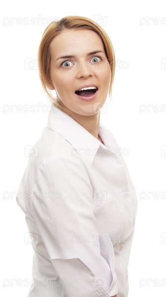 Молодая удивленная женщина на белом фоне