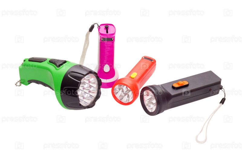 Четыре разноцветных светодиодный фонарика, на белом фоне
